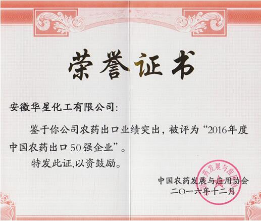 日前,安徽华星化工有限公司荣获由中国农药发展与应用协会评选的2016年度中国农药行业出口50强企业称号。