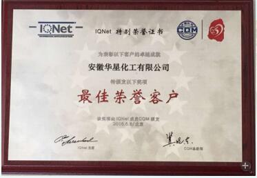 受表彰的“最佳荣誉客户”企业,是安徽方圆标志认证集团在上千家获证企业中根据企业的行业地位、体系运行、认证年限及社会信誉度等进行综合考核评选产生。此次华星化工荣获“最佳荣誉客户”称号是公司一贯采用先进产品标准,坚持质量是企业生命线,狠抓质量管理体系运行的突出体现。