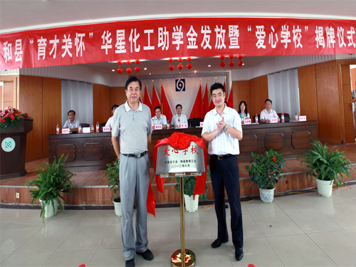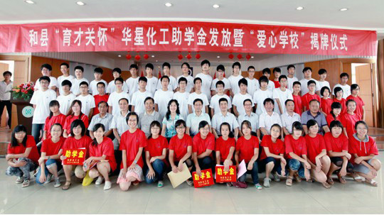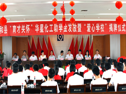8月21日上午,华星老区五楼会议室,由和县总工会和华星化工联合开展的2012年和县“育才关怀”华星化工助学金发放暨“爱心学校”揭牌仪式在这里隆重举行。马鞍山市总工会常务副主席李迅、副主席毛善群、和县县委副书记戴瑞、县人大副主任张居发、县政协副主席、县委统战部部长鲁玲、县总工会主席夏尤金出席仪式,副县长马作兵主持,出席仪式的公司领导有党委副书记行政总监张根保、工会主席盛学龙、工厂厂长谢永清。