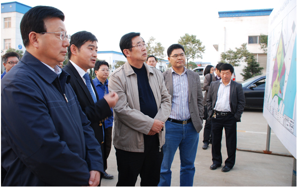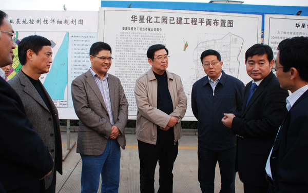 在生产区企业展示板前董事长谢平向省领导介绍了华星目前的生产经营情况,重点汇报了华星在建的30万吨离子膜烧碱一期项目和年产10万吨三氯化磷一期项目。郭万清对我司为和县工业经济发展中所取得的成绩给予了充分肯定,他希望华星立足现有产业基础,加大新技术、新品种试验与推广力度,增加农业产出效益,全面打造资源节约、环境友好的生态文明企业,促进企业又好又快发展。
