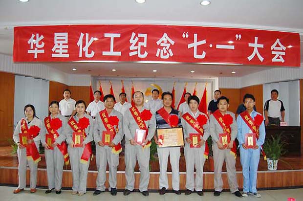 6月27日下午华星化工在公司多功能厅隆重召开纪念“七?一”党员大会,大会会场气氛庄重而热烈,神圣的党徽在十面红旗的映衬下熠熠生辉。公司总裁郭之兵、副总裁纪祖焕、行政人事中心总监张根保、工厂厂长申毅、副厂长熊惠文、工会主席盛学龙及各支部书记在主席台就坐,华星化工党委副书记周玉生主持会议。