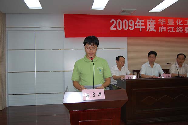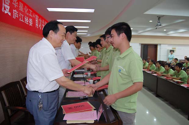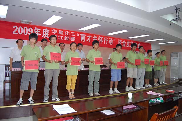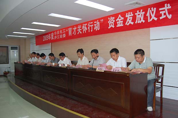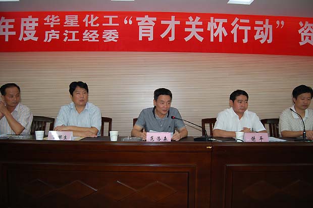 8月25日上午,2009年度华星化工、庐江经委“育才关怀行动”资金发放仪式在庐江县财政局会议室隆重举行。庐江县委书记范洛森、庐江县经委主任夏远生、庐江县经委党委副书记、纪委书记黄昌寿,华星化工董事长谢平、公司行政人事中心总监张根保、党委副书记周玉生出席了活动仪式。