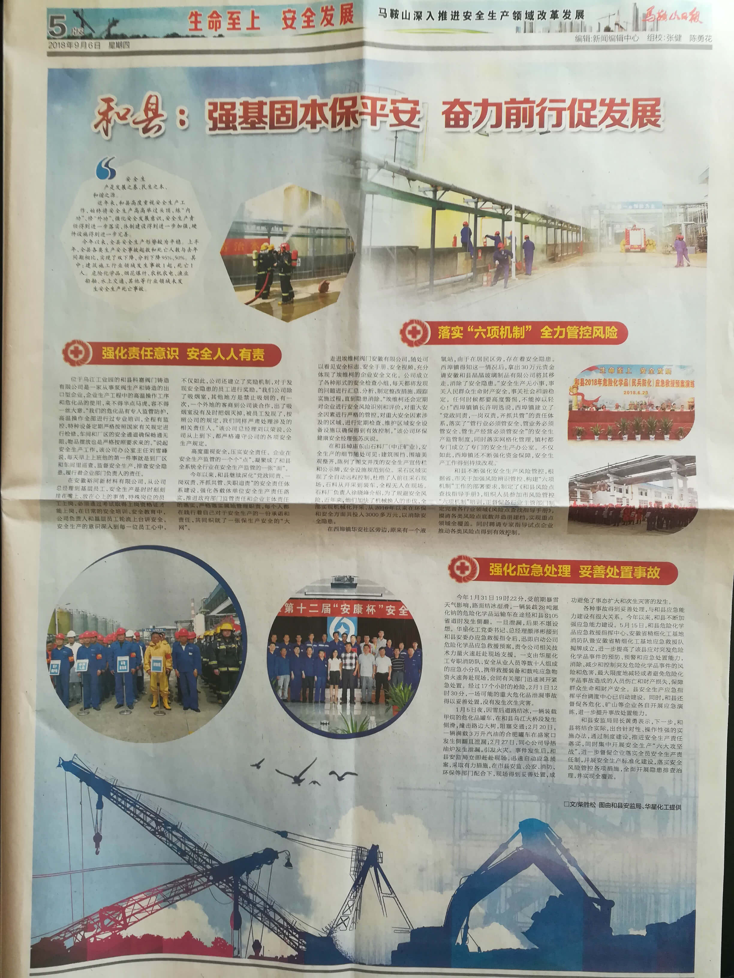 日前,马鞍山市主流报纸《马鞍山日报》、《皖江晚报》分别刊文报道和县安全生产领域改革发展建设成果,并对华星化工在安全生产管理上的重点举措进行推广介绍。