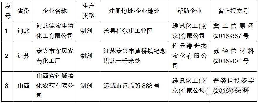 为鼓励农药生产企业兼并重组,淘汰落后,调整产业结构,2016年9月2日,工信部将2016年第5批在相关企业帮助下自愿放弃农药生产资格的企业名单予以公示,公示时间为2016年9月2~9日。并要求,如有异议,请与工信部原材料司联系。联系人:黄华树;联系电话:010-68205564。